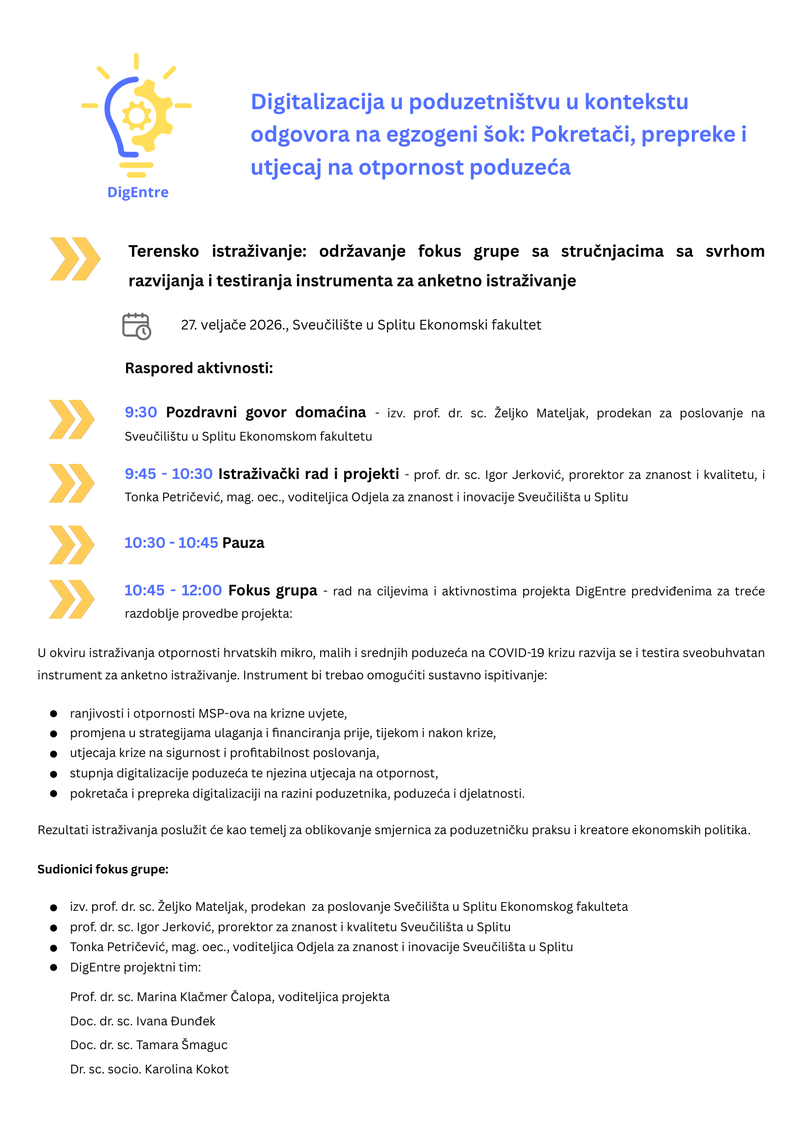 Događaju će uz članove istraživačke skupine projekta DigEntre prisustvovati izv. prof. dr. sc. Željko Mateljak, prodekan za poslovanje na Sveučilištu u Splitu Ekonomskom fakultetu prof. dr. sc. Igor Jerković, prorektor za znanost i kvalitetu, i Tonka Petričević, mag. oec., voditeljica Odjela za znanost i inovacije Sveučilišta u Splitu.
